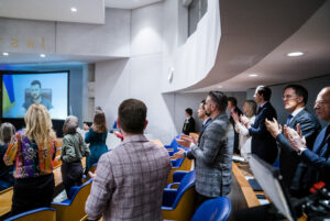 President Volodomir Zelenski van Oekraine geeft via een videoverbinding een toespraak in de Tweede Kamer (Bart Maat)