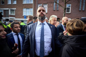 PVV-leider Geert Wilders voert samen met Sebastiaan Kruis campagne op de Haagse markt (Phil Nijhuis)